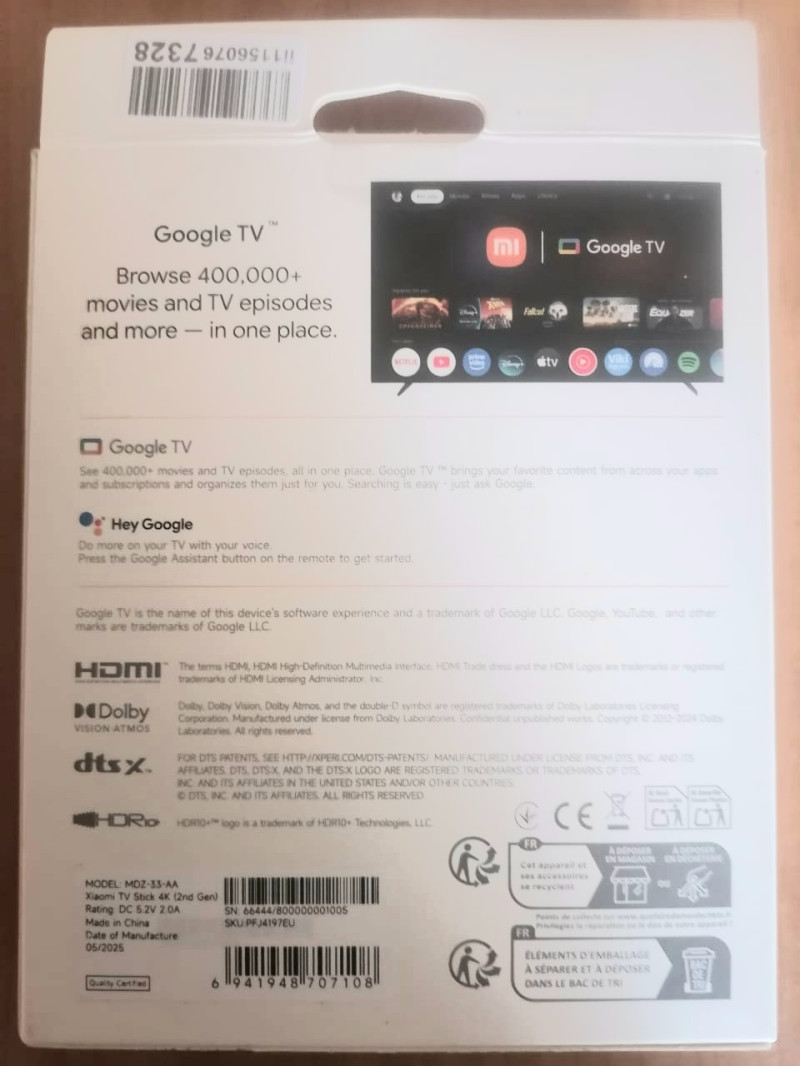 Продаётся смарт тв приставка Xiaomi Mi tv stick 4K 2nd gen - новинка 2025года. Новая приставка, была в пользовании пару дней, купили пожилому человеку, но она ему не подошла, он привык пользоваться Триколор тв. ОРИГИНАЛ, глобальная версия. Всё отлично работает, может работать от USB телевизора (современные модели) или с блоком питания от розетки. Описание Модель оснащена современным процессором, поддерживает голосовое управление и самые актуальные технологии изображения и звука. Ключевые возможности: Google TV — единый доступ к YouTube, Netflix, IVI, Кинопоиск, Okko, Megogo, Spotify, Twitch и тысячам других приложений. 4K Ultra HD с HDR10+ и Dolby Vision — чёткое, детализированное изображение с яркими цветами и глубоким контрастом. Мощный процессор (до 2. 5 ГГц) + 2 ГБ ОЗУ + 8 ГБ встроенной памяти — стабильная и быстрая работа приложений, плавное переключение между сервисами. Dolby Atmos и DTS:X — объёмный звук высокого качества для полного погружения в кино, музыку и игры. WiFi 6 и Bluetooth 5. 2 — стабильное подключение к сети и аксессуарам без задержек и прерываний. Почему стоит выбрать эту ТВ-приставку Xiaomi? Быстрый запуск — подключается за считанные минуты через HDMI. Компактные размеры и минималистичный дизайн — идеально вписывается в интерьер и легко помещается за телевизором. Современные технологии — 4K, HDR10+, Dolby Vision, Wi-Fi 6, Bluetooth 5. 2 и Google TV в одном устройстве. Совместимость — работает с любым телевизором с HDMI-портом. Xiaomi TV Stick 4K 2nd Gen — это максимум возможностей в минимальном корпусе. Наслаждайтесь фильмами, сериалами, стримингом и музыкой в высоком качестве дома, на даче или в путешествиях. Цена 3000 руб. , без торга.