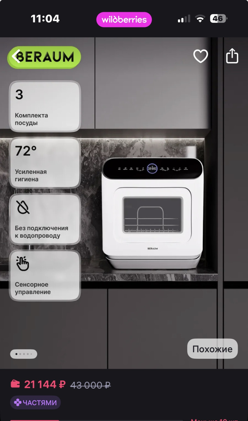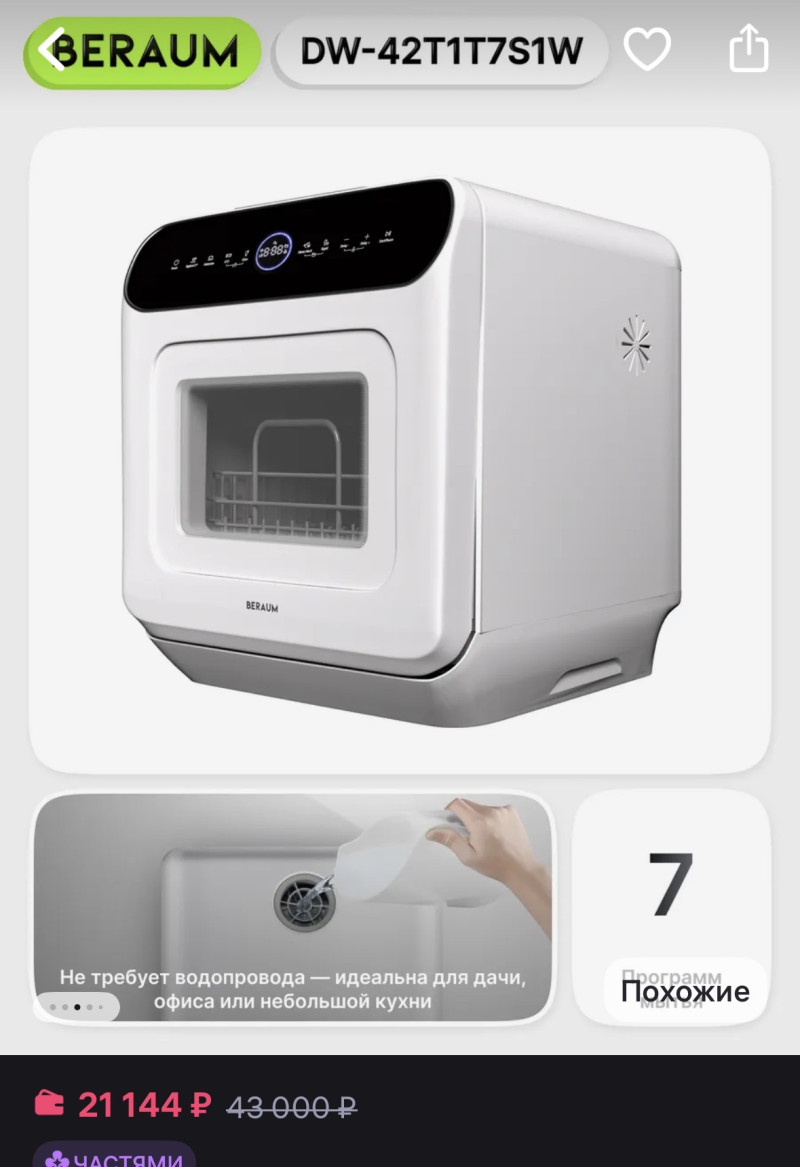 Она небольшая можно поставить на кухне на рабочую поверхность. Моет хорошо, но у меня маленькая кухня , в пользовании была неделю, товар провереный. Работает