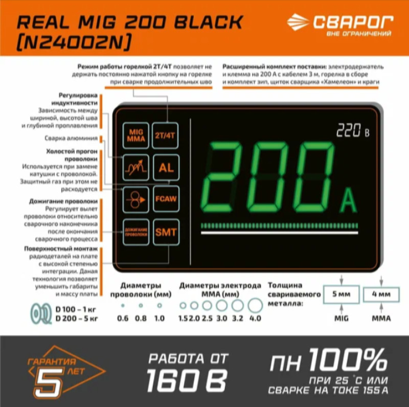 Сварочный аппарат полуавтомат СВАРОГ REAL MIG 200 BLACK (N24002N) Отличается от стандартной модели REAL MIG 200 (N24002) стильным дизайном, добавлением функции индуктивности. Аппарат предназначен для полуавтоматической сварки в среде защитных газов (MIG/MAG), сварки порошковой проволокой (FCAW), а также ручной дуговой сварки покрытым электродом (ММА). ТЕХНИЧЕСКИЕ ХАРАКТЕРИСТИКИ СВАРОГ REAL MIG 200 BLACK Номинальное напряжение на входе 230 В Max ток 200 А Min ток 30 А Max мощность 5, 3 кВт Вес 13 кг Min диаметр проволок 0, 6 Max диаметр проволок 1 Диаметр катушки 200 мм Процент нагрузки (ПН) 60 % Габариты 502х225х375 мм Частота 50 Гц Тип катушки D200 Диаметр спирали от 0, 6 до 1 мм