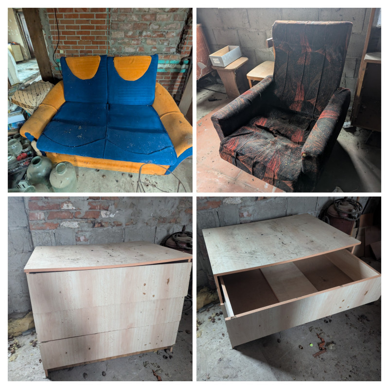 Продаётся комплект мебели в белом цвете, включающий шкаф, комод, стол с зеркалом и две прикроватные тумбы. Все элементы б/у, но сохраняют функциональность и могут стать отличным дополнением к вашему интерьеру. Мебель требует небольшой реставрации, что даёт возможность проявить творческий подход в её обновлении. Размеры шкафа: ширина 80 см, высота 210 см, глубина 53см. (1000) Кровать: Ширина 145 см. Длина 197см. Высота 95см. (1000) Стол с зеркалом имеет размеры: ширина 101см, высота стола 72, 5 высота с зеркалом 138см, глубина 42 см. (1000) Прикроватные тумбы: ширина 36см, высота 60, 5см, глубина 41, 5см. (1000 за 2шт. )Комод: ширина 100см, высота 80см, глубина 70см. (1000) Диван раскладной (500) Кресло(1000 за 2шт. ) за всё 6000